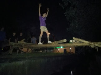 We started on the 27th by building an interlocking bridge at the hall, estimating how long we'd need it, and then moving it down to the canal and setting it up.